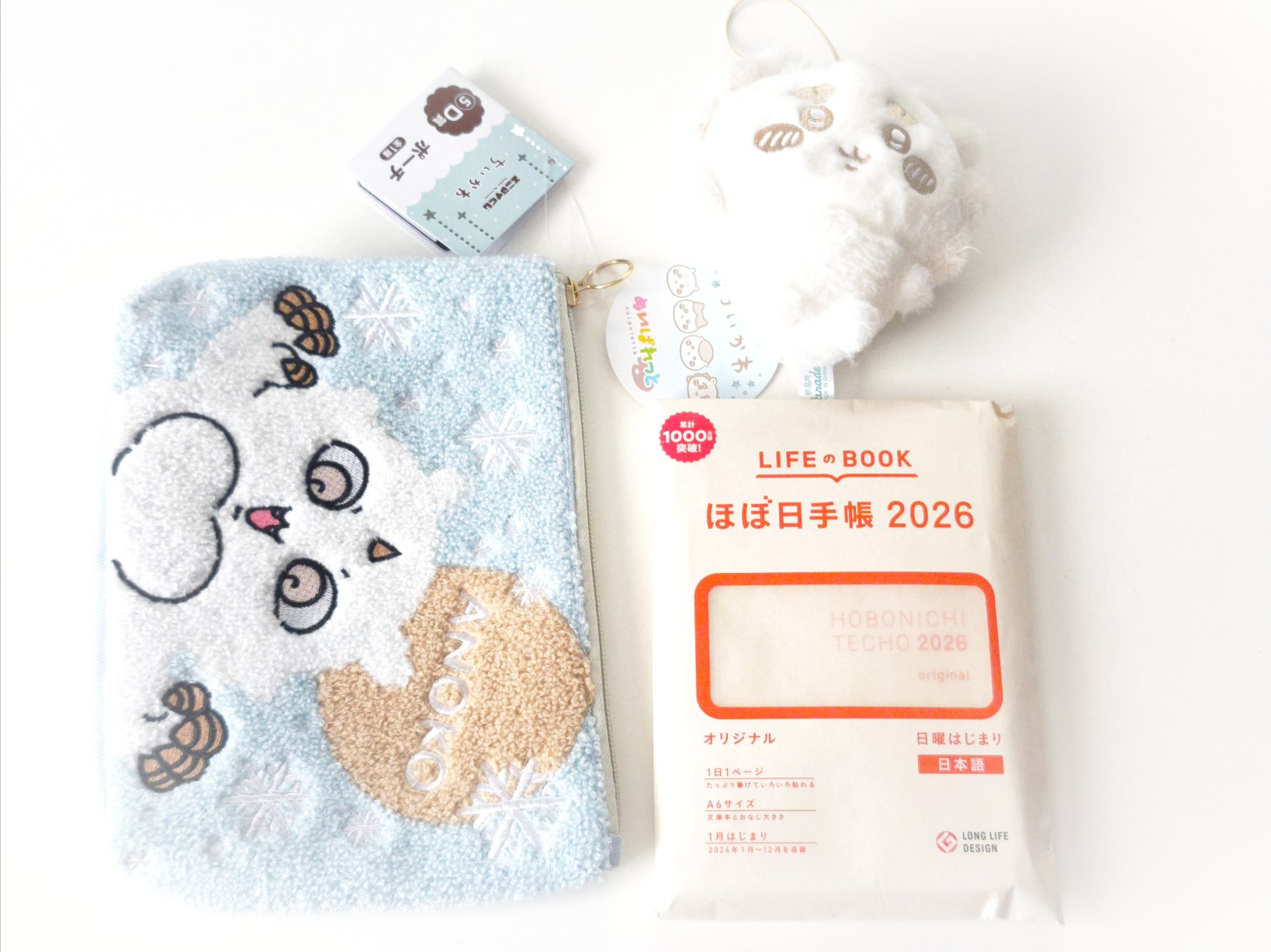 一緒に映っているのは友人がコンビニのくじで当ててくれたちいかわ あのこのポーチとプライズで運よくゲットしたふわふわのシーサー