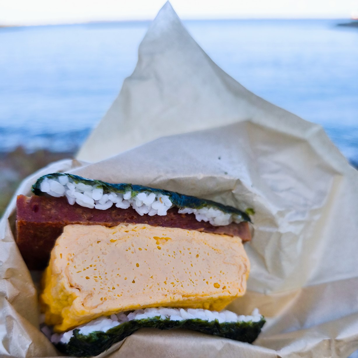旅行レポートは今更書く気力がないので割愛するんですが、その日の活動開始予定が10時からで早起きした日があって、朝ごはんもどうしようかな~だったということもあってポーク玉子おにぎりを買ってそのまま気分で海まで行ってのんびり海を眺めながらおにぎりを食べるとかしていました(自転車で20分くらいの距離でした)